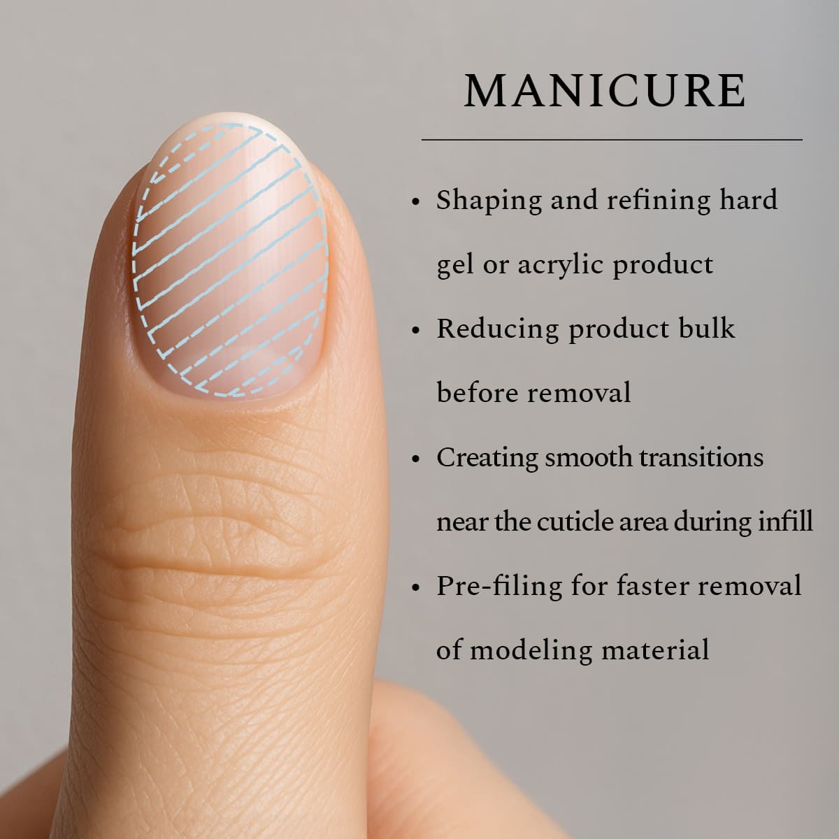 - Odstranění silných vrstev gelu nebo akrylového povlaku na nehtech