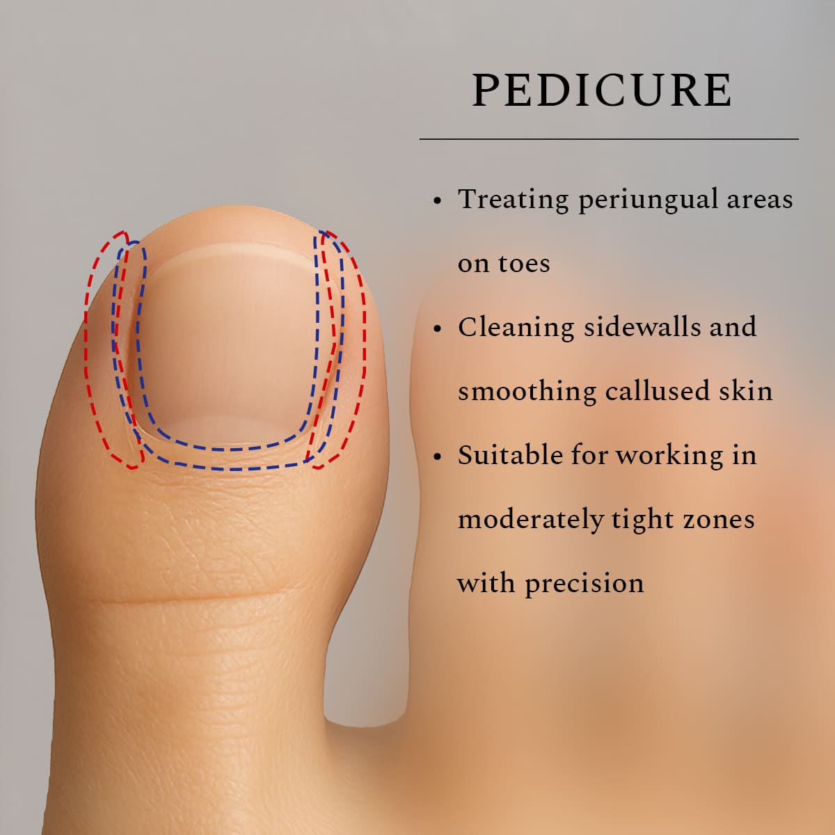 Tento diamantový kužel se střední zrnitostí a špičkou 3 mm je univerzální nástroj pro manikúru a pedikúru, ideální pro efektivní čištění kůžičky, ošetření bočních valů a vyhlazení nehtové ploténky.
